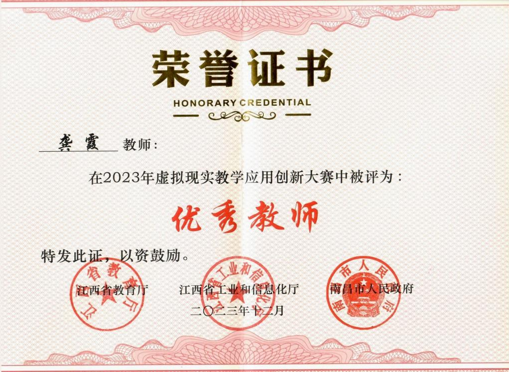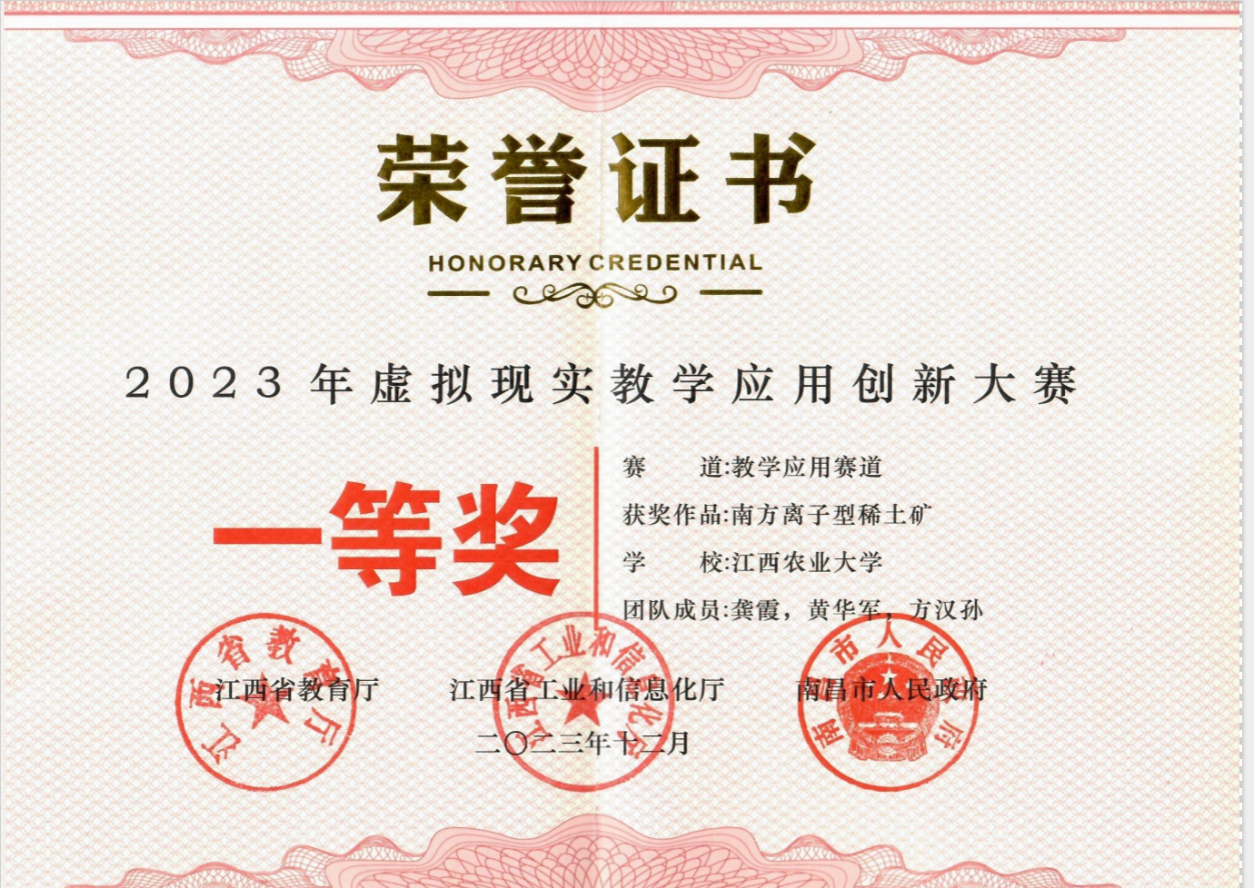 10月19日,由江西省教育厅、江西省工业和信息化厅、南昌市人民政府共同举办的2023年虚拟现实教学应用创新大赛公布比赛结果。我院龚霞教授团队凭借作品《南方离子型稀土矿》在教学应用赛道中荣获一等奖,并获优秀教师奖。