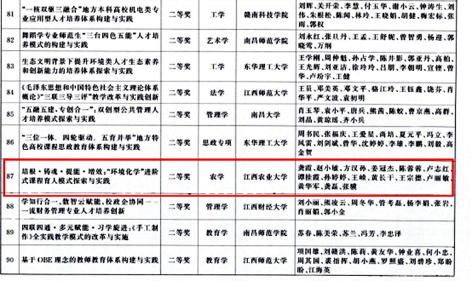 2023年12月29日,江西省人民政府文件(赣夫3字[2023]88号)公布了关于2022年江西省教学成果奖授奖决定。best365官网龚霞教授团队的教学成果“培根· 铸魂·提能·增效:“环境化学”进阶式课程育人模式探索与实践”获得江西省高等教育类(本科层次)教学成果奖二等奖,是我校5项江西省教学成果奖中唯一一个基于单门课程的教学成果奖。
