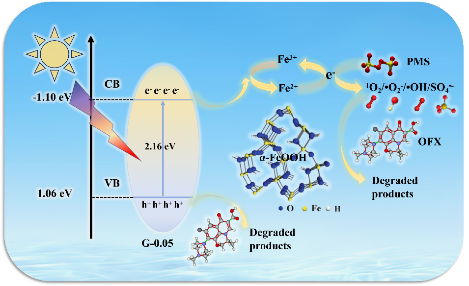 氧空位与Fe2+/Fe3+循环的协同催化机制尚不明确,加之表面反应动力学缓慢等瓶颈问题严重制约过硫酸盐(PMS)活化以及光芬顿降解典型污染物的性能。基于此,本论文拟设计制备一种兼具氧空位和Fe2+/Fe3+循环特性的天然廉价针铁矿催化剂(G-0.05),并将其用于光促活化PMS降解氧氟沙星(OFX)性能研究。结果表明,在G-0.05/PMS/Vis体系中,40分钟内可去除91.1%的 OFX模型污染物,且降解效率是原始针铁矿(GT)的4.29倍。EPR和自由基淬灭实验表明,G-0.05/PMS/Vis体系中可同时生成多种物种(SO4∙-、∙OH、∙O2-和1O2),其中SO4∙-、∙O2-和1O2被证实是降解 OFX 的关键活性物种。此外,为增强目标催化剂的光催化稳定性,将G-0.05与普通水凝胶组装后,制备的G-0.05/藻酸钙球形水凝胶在五次循环后对 OFX 的消除效率超过80%。催化机理表明,Fe2+/Fe3+与氧空位的协同效应促进了PMS活化和 OFX 降解,并提出了G-0.05/PMS/Vis体系中 OFX 的可能降解过程机制。总体而言,该体系作为净化有机污染物废水的环保技术,展现出显著效果。
