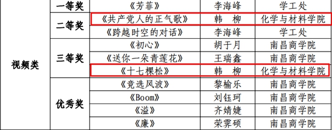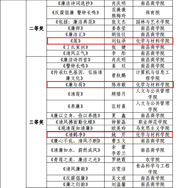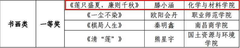 近日,校纪委、省监委驻学校监察专员办公室联合发文《关于公布2024年校园廉洁文化作品征集活动获奖名单的通知》,best365官网师生报送的多项作品获奖。其中,学院团委书记韩柳报送的视频作品《共产党人的正气歌》《十七棵松》分别荣获视频类作品一等奖及三等奖,应化2203班滕小涵作品《莲只盛夏,廉则千秋》荣获书画类作品一等奖,应化2202班刘钰泽作品《莲》荣获书画类作品二等奖,材料2302班陈沛毅作品《廉与荷》及应化2202班姚芹作品《清鹤净》荣获书画类作品三等奖。
