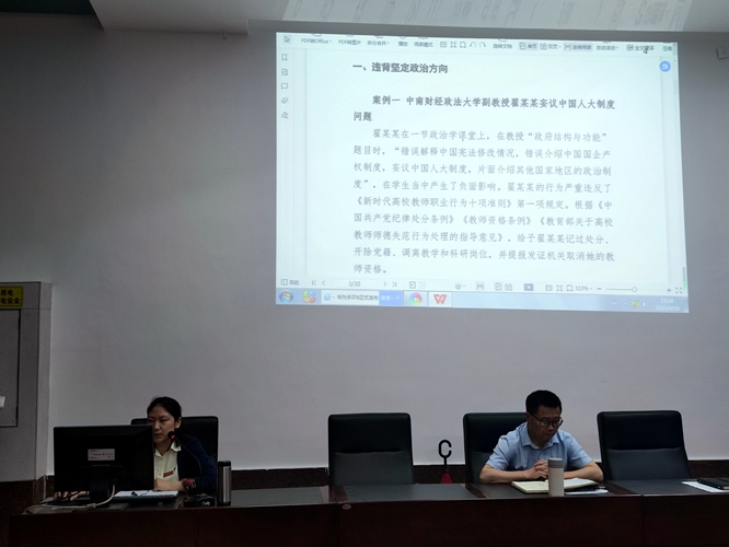 会上,学院党委副书记叶健带领全体教职工认真学习了学校党委教师工作部下发的《违反高校教师职业行为十项准则典型案例汇编》第一期“违背坚定政治方向、违背自觉爱国守法、违背传播优秀传统文化”等十个方面的内容。