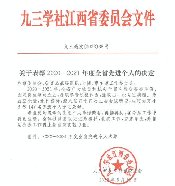 近日,九三学社江西省委印发《关于表彰2020-2021年度全省先进个人的决定》,best365官网龚霞老师被授予2020-2021年度“全省优秀个人”荣誉称号,龚霞老师也是我校本次唯一获此殊荣的老师。
