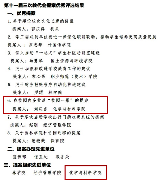 2025年1月8日,学校公布了第十一届三次教代会提案优秀评选结果,学院党委书记刘庆言提出的“在校园内多营造“校园一景”的提案”获评优秀提案,学院分工会获评提案组织先进单位。这也是best365官网连续获评优秀提案和提案组织先进单位。