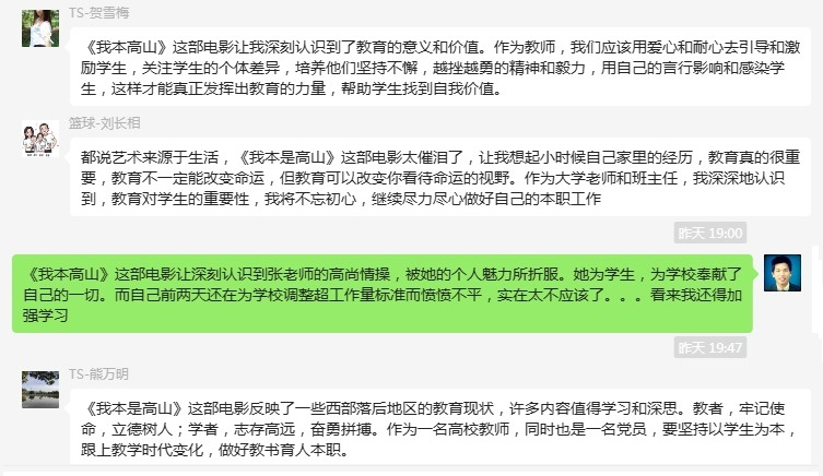影片结束后,支部党员纷纷结合自己的工作发表了观影感受。大家纷纷表示,电影令人感动不已,被张老师的高尚情操和无私奉献所折服。要学习张校长的大爱教育情怀,多为被教育者着想,为国家为人民为社会作出自己的积极贡献。