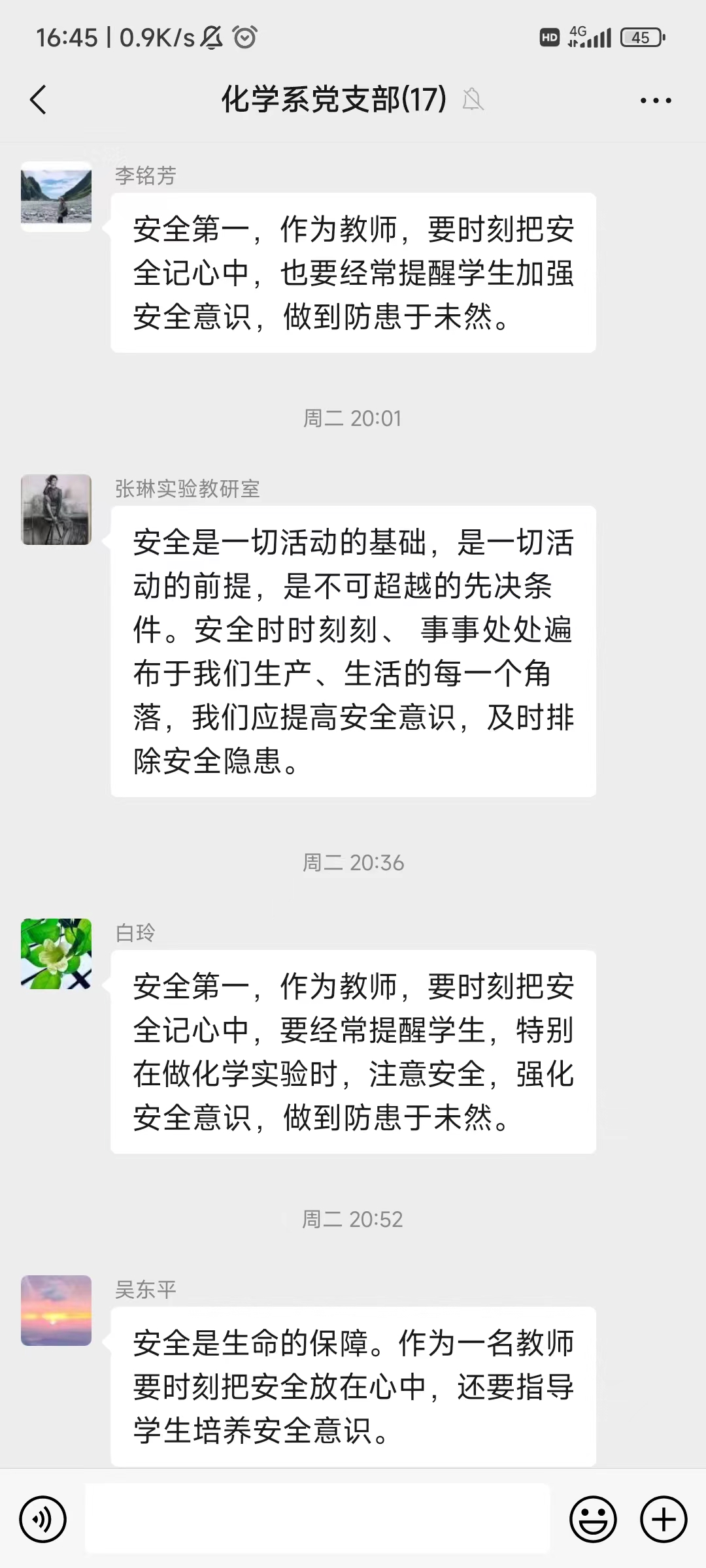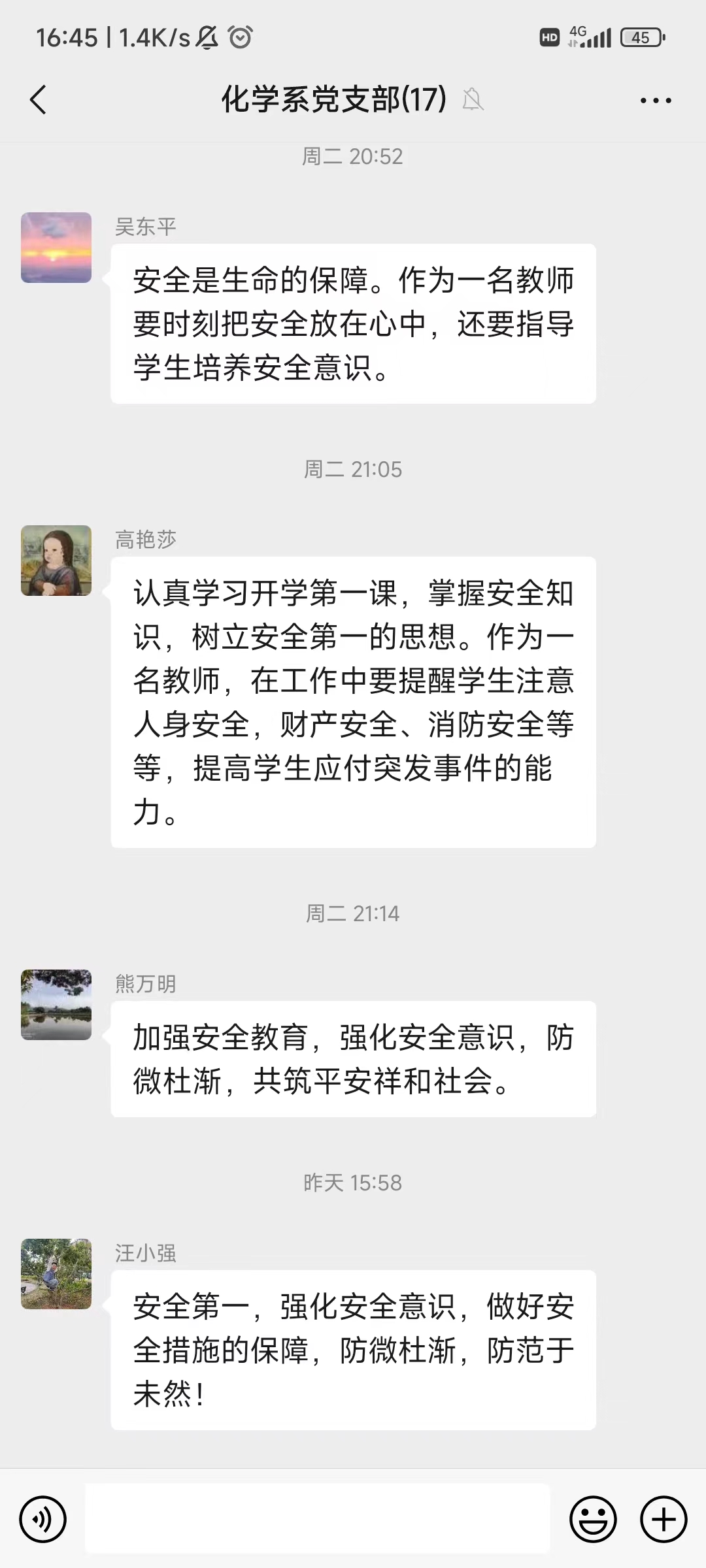 2024年2月27日,为落实学校关于开展2024年春季“开学第一课”暨安全教育周活动的通知的精神,化学系党支部以“安全教育”为主题开展主题党日活动,各党员同志认真学习贯彻文件要求,同时在微信热烈交流讨论,分享自己的学习体会。通过本次党日活动,提高了安全防范意识、增强了自我防护能力。