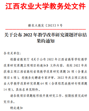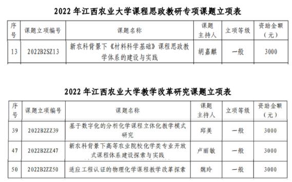 2023年3月24日,赣农大教发[2023]9号文件公布了2022年教学改革研究课题评审结果,2022 年共立项best365手机版官网教学改革研究课题 64 项(含课程思政教研专项课题 14 项)。材料与化工支部共获批4项,其中,胡嘉麒主持的“新农科背景下《材料科学基础》课程思政教学体系的建设与实践”获批课程思政教研专项课题,卢丽敏主持的“新农科背景下高等农业院校化学类专业开放式课程体系建设探索与实践”、邱美主持的“基于数字化的分析化学课程立体化教学模式研究”、魏玲主持的“适应工程认证的物理化学课程教学改革探索”分别获批best365手机版官网教学改革研究课题。希望材料与化工支部党员再接再厉,再创佳绩!