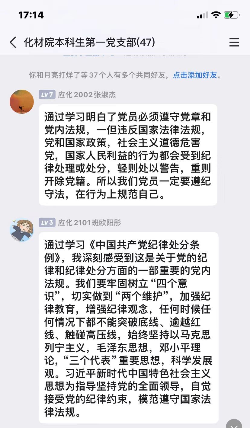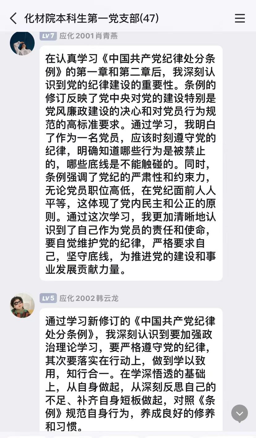 2024年4月30日,本科生第一党支部通过线上线下相结合的方式开展4月份主题党日,组织支部党员认真学习《中国共产党纪律处分条例》(下文简称《条例》)第一章“总体要求和适用范围”及第二章“违纪与纪律处分”条款内容。
