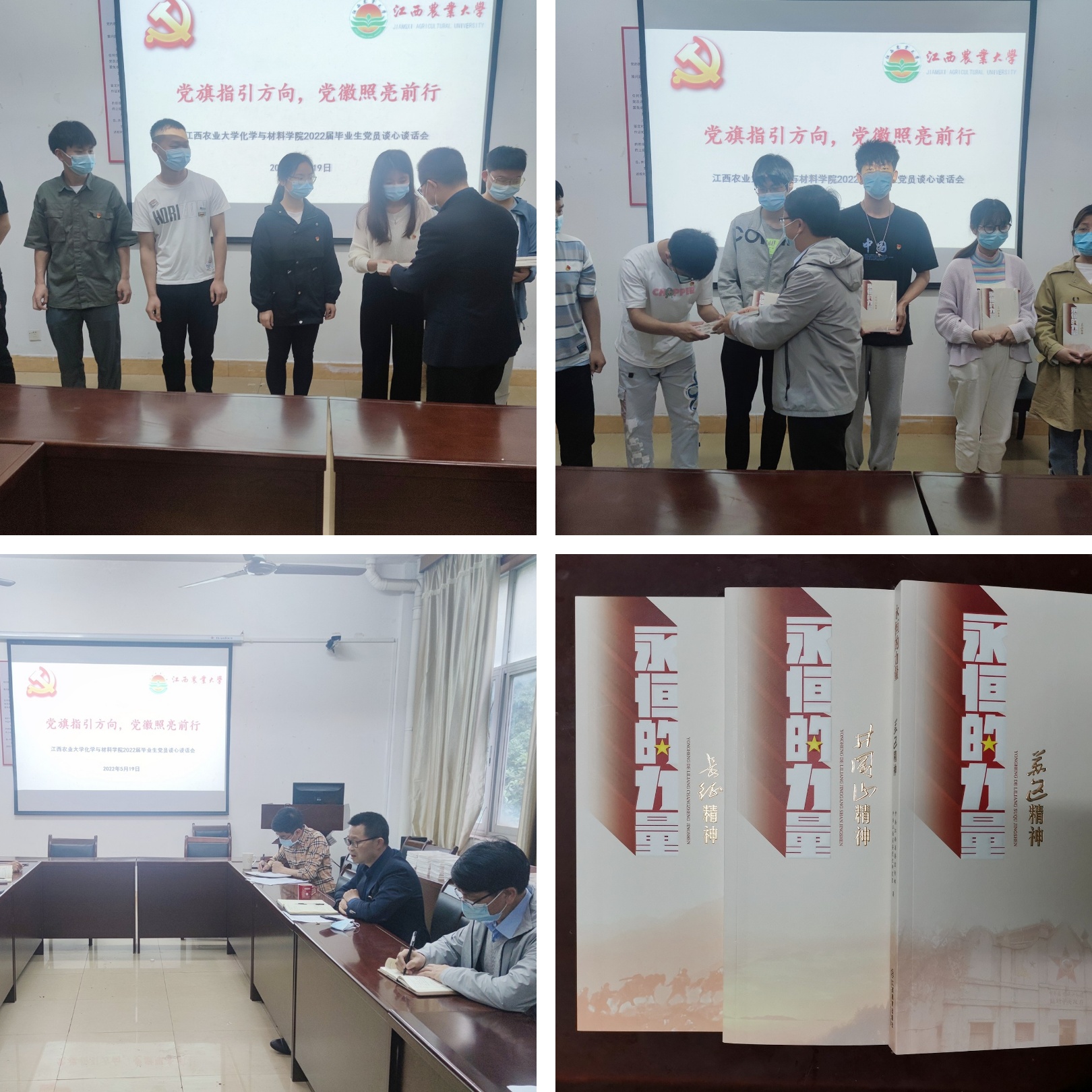 一套书籍就是一次灵魂升华。江西是一片“红土地”,红色资源遍布赣鄱大地。为充分发挥江西红色文化的育人功能,学院领导为每位毕业生党员赠送了《井冈山精神》、《长征精神》、《苏区精神》三本红色书籍。“有信念、有梦想、有奋斗、有奉献的人生,才是有意义的人生”,通过宣读《给毕业生党员的一封信》、重温入党誓词,勉励党员们在学思践悟中坚定理想信念,在奋发有为中践行初心使命,以实际行动走好新时代的长征路,在青春的赛道上奋力奔跑,争取跑出当代青年的最好成绩。