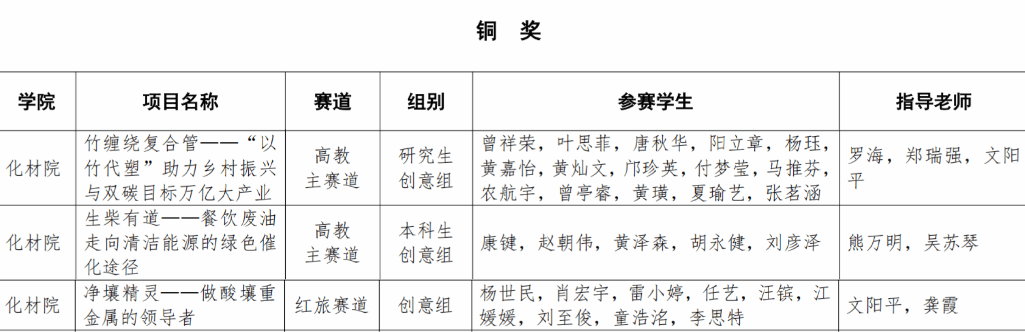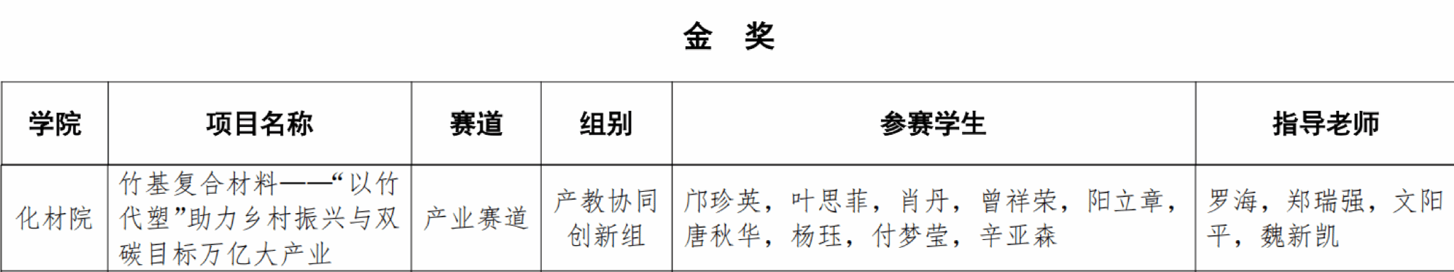 《竹基复合材料——“以竹代塑”助力乡村振兴与双碳目标万亿大产业》项目荣获产业赛道产教协同创新组金奖;《竹缠绕复合管——“以竹代塑”助力乡村振兴与双碳目标万亿大产业》《生柴有道——餐饮废油走向清洁能源的绿色催化途径》《净壤精灵——做酸壤重金属的领导者》三个项目分别在高教主赛道、红旅赛道斩获铜奖