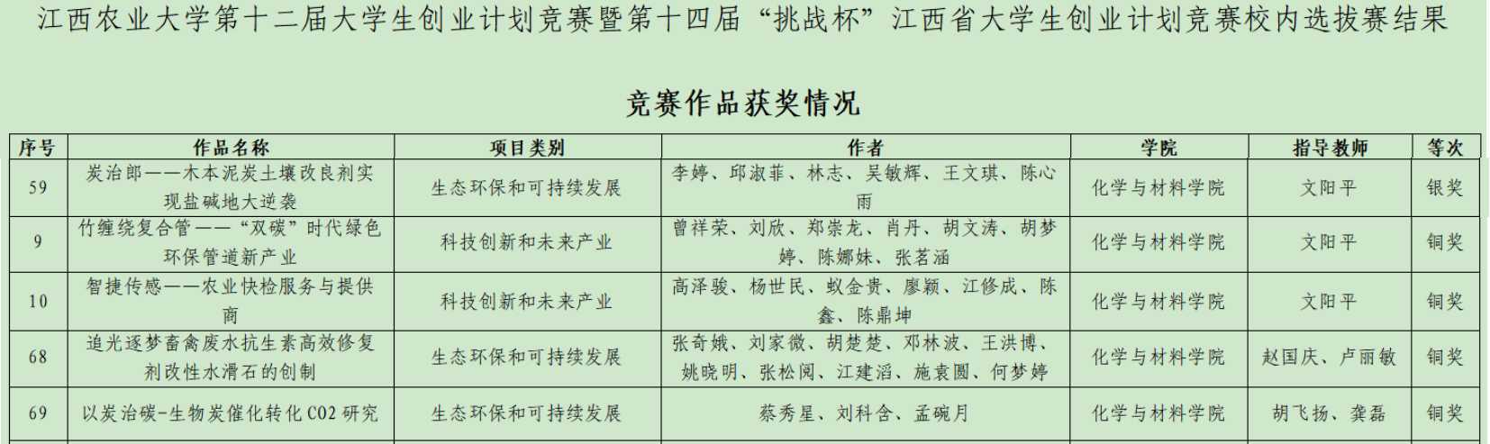 9月3日,第十二届大学生创业计划竞赛暨第十四届“挑战杯”江西省大学生创业计划竞赛校内选拔赛圆满落幕。best365官网《炭治郎——木本泥炭土壤改良剂实现盐碱地大逆袭》(指导老师:文阳平,团队成员:李婷、邱淑菲、林志、吴敏辉、王文琪、陈心雨)获银奖;《竹缠绕复合管——“双碳”时代绿色环保管道新产业》(指导老师:文阳平,团队成员:曾祥荣、刘欣、郑崇龙、肖丹、胡文涛、胡梦婷、陈娜妹、张茗涵)和《智捷传感——农业快检服务与提供商》(指导老师:文阳平,团队成员:高泽骏、杨世民、蚁金贵、廖颖、江修成、陈鑫、陈鼎坤)获铜奖;《追光逐梦畜禽废水抗生素高效修复剂改性水滑石的创制》(指导老师:赵国庆、卢丽敏,团队成员:张奇娥、刘家微、胡楚楚、邓林波、王洪博、姚晓明、张松阅、江建滔、施袁圆、何梦婷)和《以炭治碳-生物炭催化转化CO2研究》(指导老师:胡飞扬、龚磊,团队成员:蔡秀星、刘科含、孟碗月)获铜奖。此外,best365官网获优秀组织奖,学工办邓雪云老师获大赛组织先进个人奖。