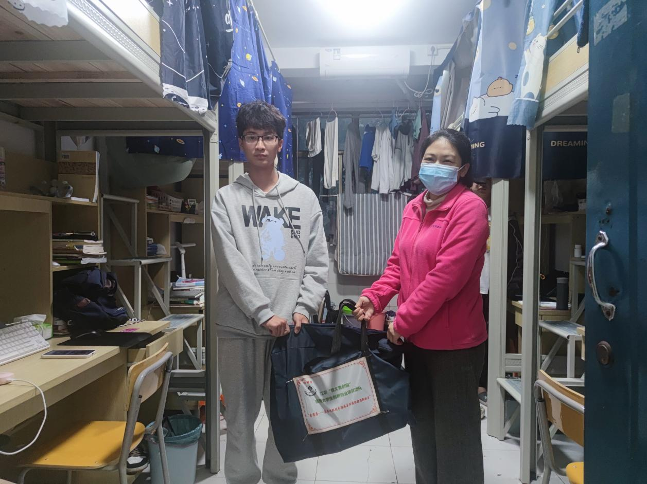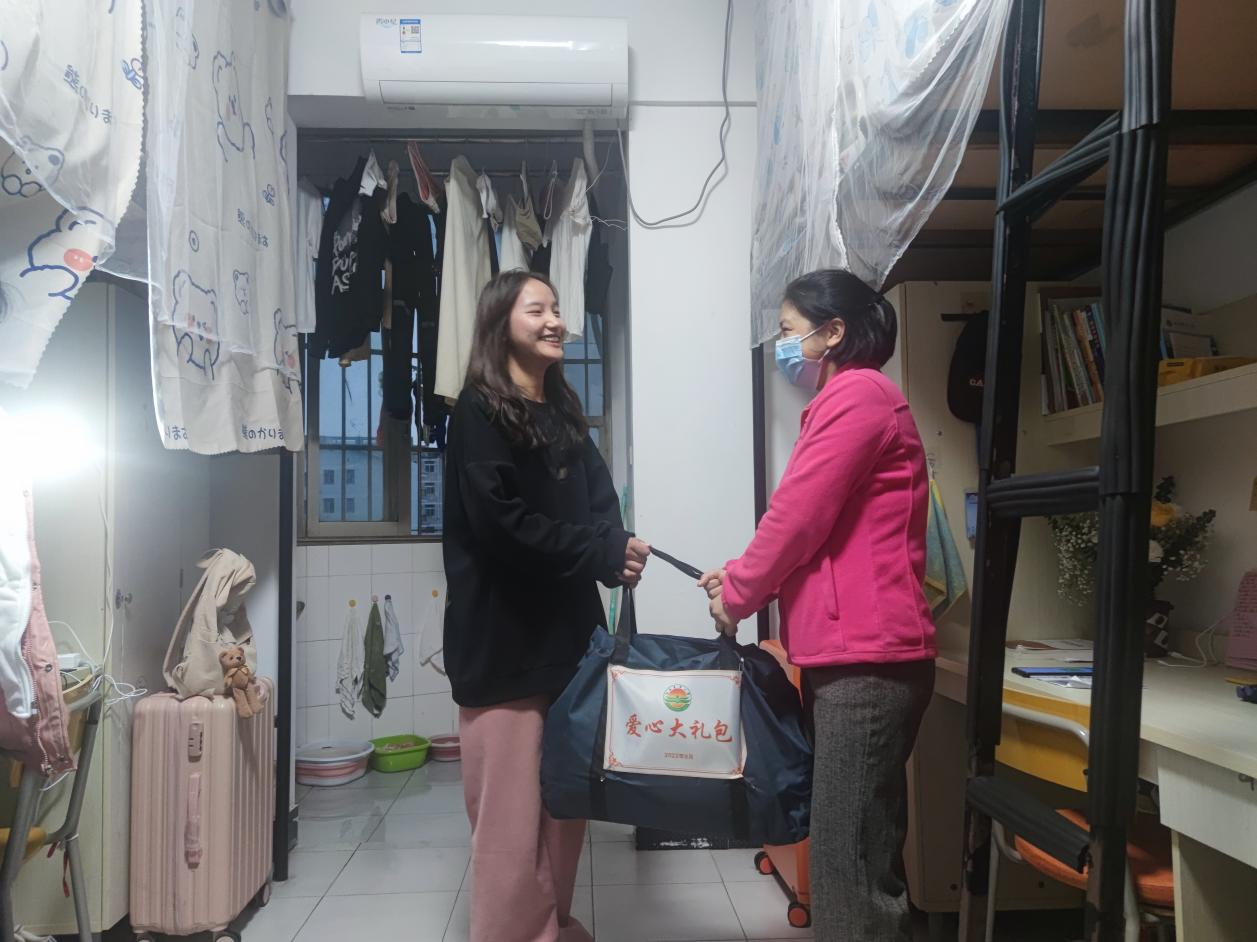 2022年11月19日下午,学院党委副书记叶健来到新生寝室为赵德福、陈甜两位新生发放爱心礼包。