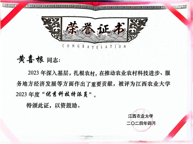 据了解,本次共有20名同志荣获学校2023年度“优秀科技特派员”称号,best365官网黄喜根教授名列其中,这也是黄喜根教授连续第七年荣获此殊荣。