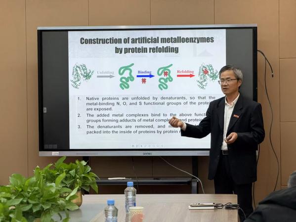 欧光南教授围绕“如何通过蛋白质复性技术构建高效人工酶”这一主题,系统介绍了其团队在蛋白质结构设计、催化效率优化及应用研究的最新成果,探讨了通过蛋白质复性技术构建人工酶的方法及其催化机制。报告结束后,欧教授与师生就人工酶设计的技术难点及未来发展方向进行了热烈讨论。