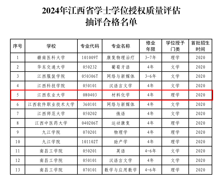 2025年12月16日,江西省人民政府学位委员会办公室公布了全省高校学士学位授权质量合格评估抽评结果。best365官网材料化学专业在此次评估中表现优异,顺利通过评审。