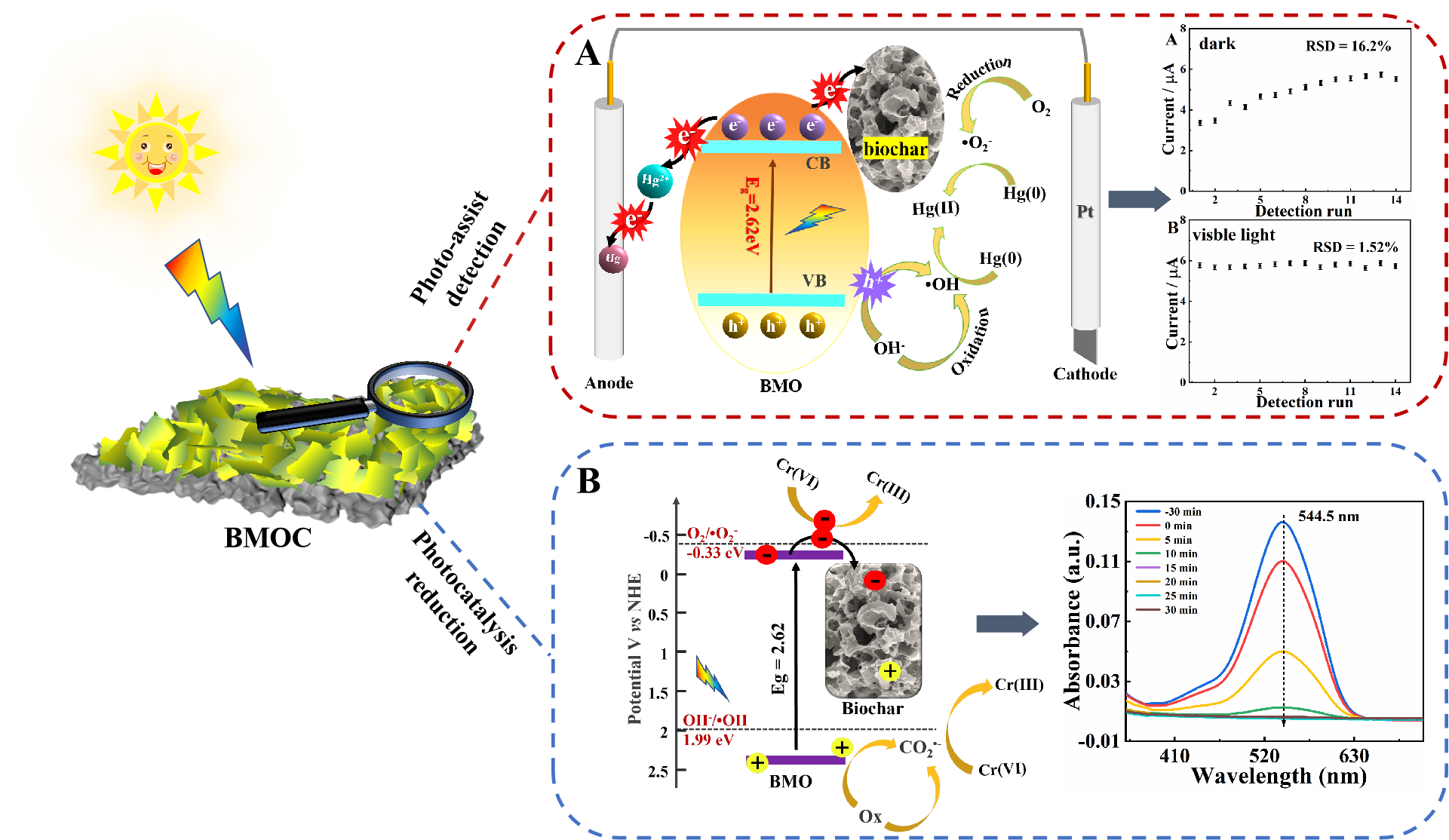 为了解决这一问题,本文开发了一种新型钼酸铋/生物炭(BMOC)复合材料,将其构建光辅助电化学传感器用于Hg(Ⅱ)的检测。在可见光照射下,与DPASV工艺配合,BMOC产生的电子,空穴和丰富的活性氧(•O2-和•OH)有效提高了检测灵敏度,消除了记忆效应,实现了BMOC电极的再生。所构建的光辅助电化学传感器对Hg(Ⅱ)的检测限低至3×10-5 µg·mL-1。此外,BMOC材料还被应用于光催化还原Cr(VI),在可见光照射下,30分钟内Cr(VI)(10µg·mL-1)的还原率达到99.99%。