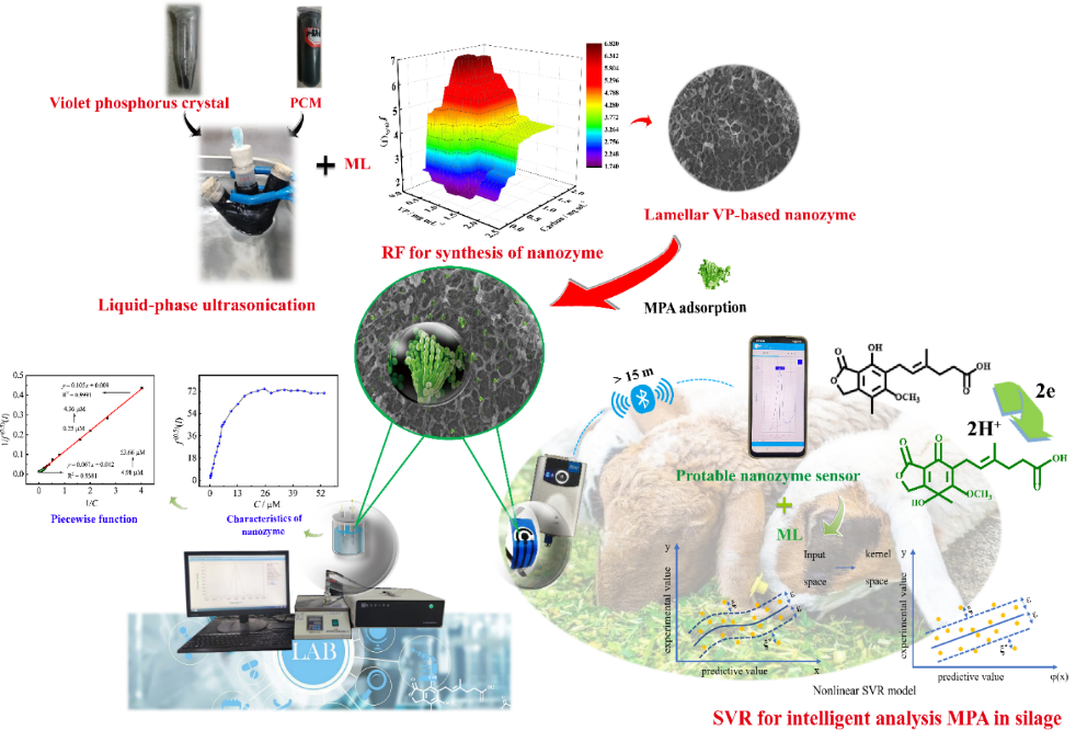 2023年7月6日,best365手机版官网文阳平教授和动科院瞿明仁教授为共同通讯作者,博士研究生戈钰为论文第一作者,在TOP一区《Biosensors and Bioelectronics》(IF=12.545)发表题为“Machine learning-guided the fabrication of nanozyme based on highly-stable violet phosphorene decorated with phosphorus-doped hierarchically porous carbon microsphere for portable intelligent sensing of mycophenolic acid in silage”的论文,该研究工作得到了国家自然科学基金和国家现代农业产业技术体系的支持。