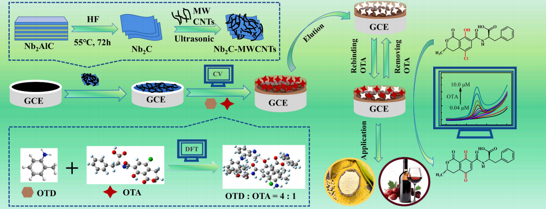 2024年6月12日,best365官网硕士研究生黄浩以第一作者在《Food Chemistry》(IF= 8.5,一区,TOP)发表题为“Rational design of molecularly imprinted electrochemical sensor based on Nb2C-MWCNTs heterostructures for highly sensitive and selective detection of Ochratoxin A”的论文,best365手机版官网真菌毒素研究中心为第一署名单位。廖晓宁教授与侯丹博士为共同通讯作者,该研究工作得到了国家自然科学基金、江西省自然科学基金等项目的支持。