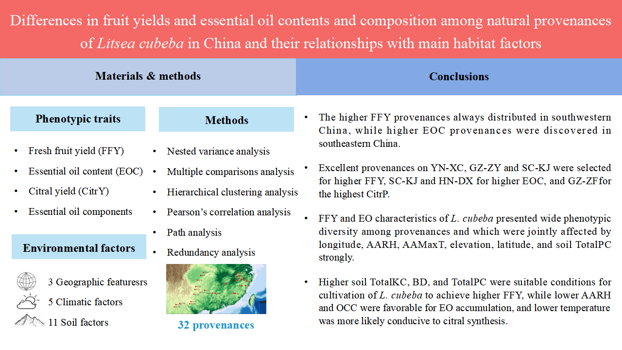 1月21日,国家林草局木本香料(华东)工程技术研究中心、best365手机版官网植物天然产物与林产化工研究所的木本香料团队在Industrial Crops and Products期刊(农林类一区Top期刊,IF=6.449)上发表了题为Differences in fruit yields and essential oil contents and composition among natural provenances of Litsea cubeba in China and their relationships with main habitat factors的论文。该研究历经10年在开展全国12省调查和采集了10000多株山苍子,解析了在不同天然种源间山苍子果实产量及精油特性的丰富表型变异特征,高产山苍子主要分布在我国西南地区 (低经度、低纬度与高海拔地区),高精油含量的山苍子主要分布在我国东南地区 (高经度、高纬度与低海拔地区),筛选出多个高产种源、高精油种源和高柠檬醛种源;阐明了影响天然山苍子果实产量及其精油特性的主要环境因素,全面解析了经度、纬度、海拔、年平均相对湿度、年平均最高温度和土壤磷含量是影响山苍子产量和精油特性多样性的最主要环境因素。研究还显示,较高的土壤钾、磷和容重可提高山苍子鲜果产量,而较低的年平均相对湿度和土壤有机质有利于山苍子精油的形成或积累,且较低的温度才更有利于柠檬醛的合成或积累。该研究成果取得了山苍子优良资源筛选方面研究的重要进展,将为我国山苍子良种选育和高效栽培技术提供重要依据。