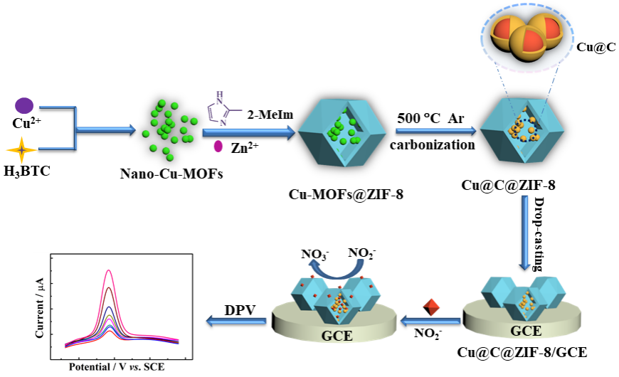 论文中基于核壳结构的Cu@C@ZIF-8复合材料构建了一种新型电化学传感器用于亚硝酸盐的高选择、灵敏检测。Cu@C@ZIF-8由简单易操作的两步法制得。首先,利用化学共沉淀方法制备核壳结构的Cu-MOF@ZIF-8。然后,基于两组分MOF之间的热稳定性差异,在N2气氛中对Cu-MOF@ZIF-8进行选择性热处理,可仅将Cu-MOF热解为Cu/C杂化材料,而保留ZIF-8 固有的晶态多孔结构,获得 Cu@C@ZIF-8核-壳型复合结构。由于Cu对亚硝酸根具有良好的电催化作用,而 ZIF-8 晶态外壳具有一定尺寸的孔道结构,因此,Cu@C@ZIF-8传感器对亚硝酸盐的检测展现了优异的传感性能, 检出限低至0.033 µmol∙L-1 (S/N= 3)。同时,该传感器还具有良好的选择性、稳定性和再现性,并成功应用于香肠样品中的亚硝酸盐定量测定。