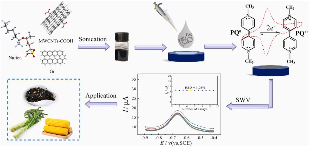 百草枯(Paraquat, PQ)是一种联吡啶类除草剂,在农业广泛使用导致食品污染和环境污染通过食物链对人们食品安全也会产生严重威胁,本文开发了一种新型聚合物纳米复合材料,即高导电石墨烯和多壁碳纳米管共改性的Nafion (Nf-Gr-MWCNTs-COOH),通过电化学传感的方法用于食品中PQ的检测Nafion是一种超强酸催化剂,尽管它对PQ有电化学氧化还原响应,但由于其固有的电子导电性差,导致灵敏度低,很少用作电催化剂来放大检测信号,因此可以通过改性的方法来提高对检测物的灵敏度。在各种改性剂中,还原氧化石墨烯(Gr)可以有效地改善MWCNTs的分散性,同时MWCNTs可以通过π-π相互作用增强Gr的电导率和比表面积,从而形成在水中高度分散的三维结构纳米杂化物,Nafion结合可以增加Gr-MWCNTs-COOH的分散性和稳定性,PQ的检测具有优异的灵敏度和稳定的输出信号。