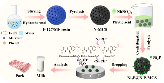 开发一种低成本、准确、快速的食品中氯霉素(CAP)残留检测策略至关重要。在本研究中,利用Ni2P嵌入N,P共掺杂介孔碳纳米球(Ni2P@N,P-MCS)开发了一种高性能的电化学平台,用于检测动物源性食品中的CAP。Ni2P@N,P-MCS材料具有独特的介孔结构和较大的比表面积,表现出了优异的吸附性能。N,P共掺杂的杂原子增强了MCS的电导率和活性中心,促进了快速传质和电子转移。Ni2P的引入增加了活性位点,增强了电催化活性。利用这些优势,基于Ni2P@N,P-MCS的电化学传感器表现出了出色的检测性能,线性范围从0.04到250 μM,检测限为12 nM。该传感器还显示出良好的再现性、稳定性和抗干扰性。此外,该传感器已在牛奶和猪肉样品中成功测试,显示出令人满意的回收率,表明其可用于实际样品分析。