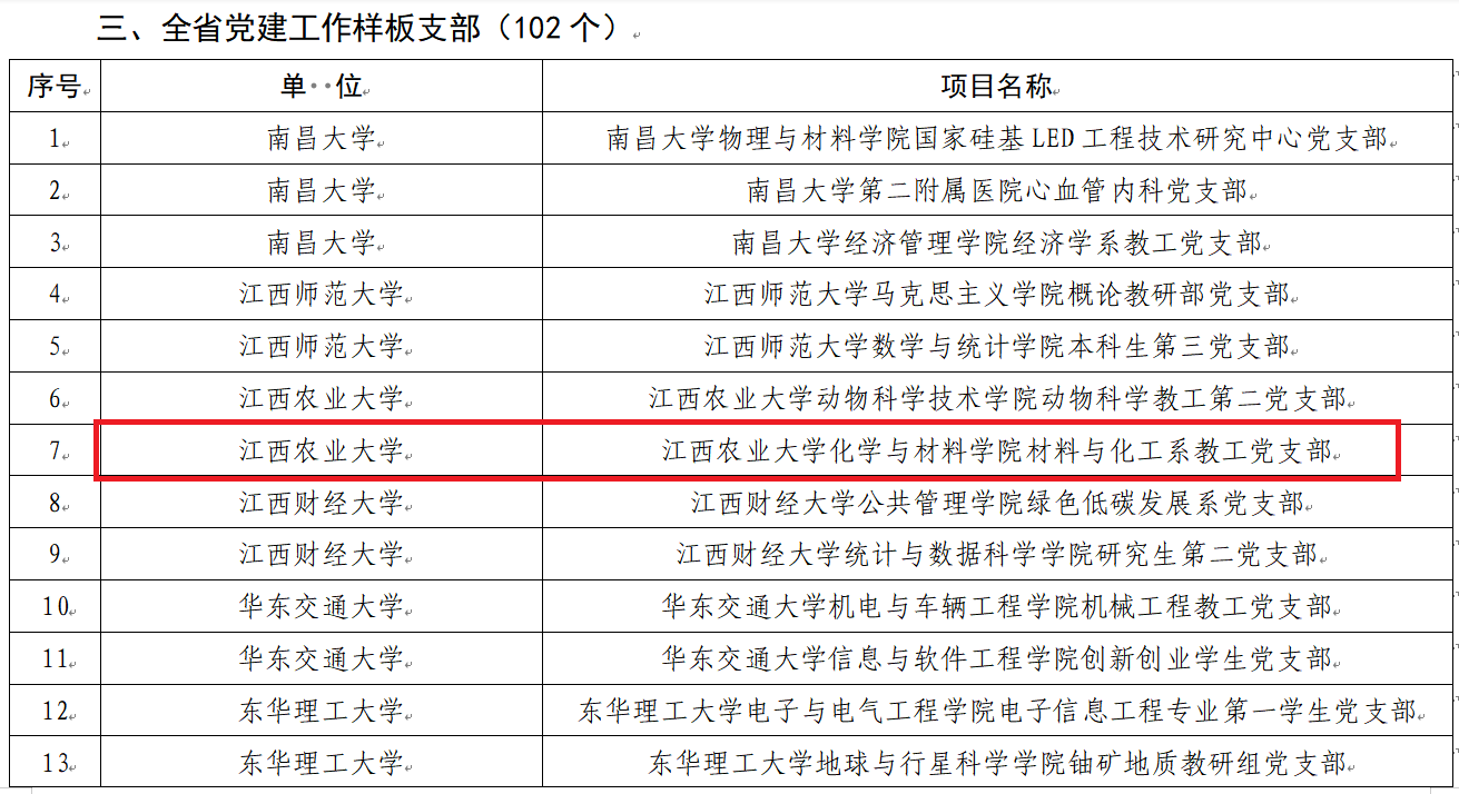 近日,江西省教育厅发布《关于公布全省第二批新时代高校党建示范创建和质量创优培育创建单位名单的通知》,材料与化工系教工党支部获评为全省党建工作样板支部,同时也是学院首个省级样板党支部,实现了学院党建工作新的突破。